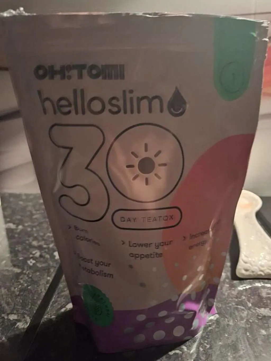 Чаят Hello Slim Night Tea на Oh!Tomi е част от детокса в два етапа. Той е разработен за активни хора, които искат спокойствие и отпускане в края на интензивния ден. В състава на чая ще откриете само натурални съставки като мента, лимонова трева, портокалови кори, корен от джинджифил, ябълка, корен от цикория и сладък корен.